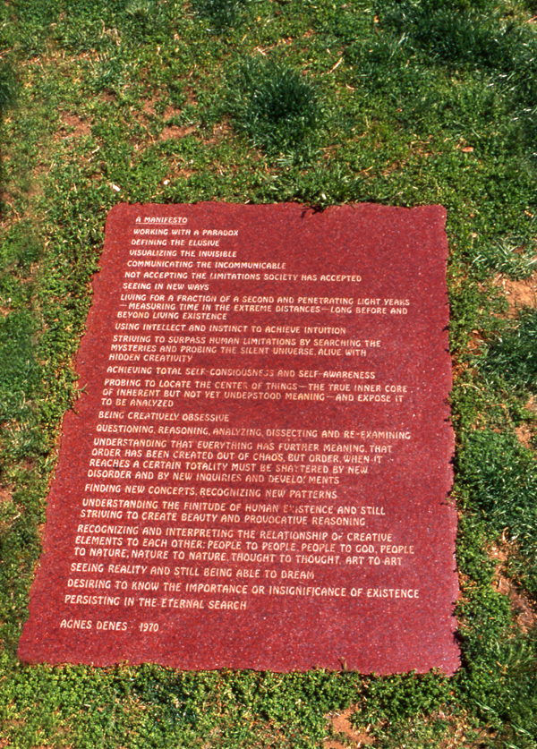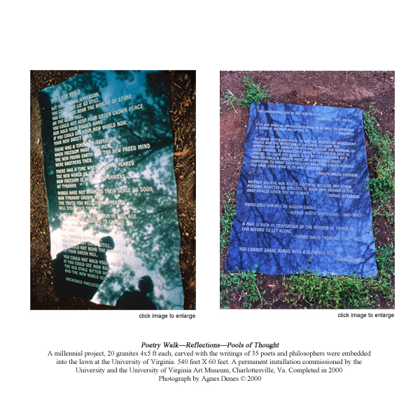 Poetry Walk is a gift to Thomas Jefferson's university and its students to make them reflect, be encouraged to affect change, and perhaps see the world in a better light. I believe that artistic vision, image and metaphor are powerful tools of communication that can become expressions of human values with profound impact on our consciousness and collective destiny. I was asked to include my Manifesto from 1970 that announced my commitment to a new art form whose ideals served others, not the self.