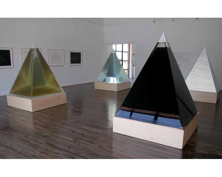 One of the pyramids is filled with crystal clear water, the other with polluted water from the Rio Grande. Another is filled with crude oil, the common denominator. The final pyramid is a mirror in which you see yourself reflected, whatever you do, feel, fight against, or agree to. It reflects the drama of it all.