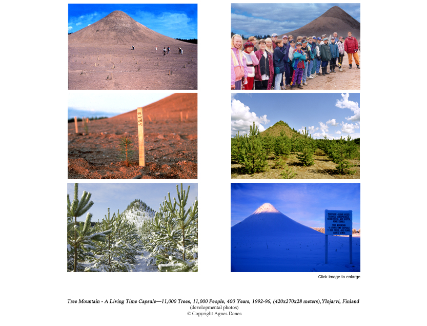 On June 5, l992, World Environment Day, at the Earth Summit in Rio de Janeiro, the Government of Finland announced that its Ministry of the Environment and the United Nations Environment Program would sponsor Tree Mountain-A Living Time Capsule, as Finland's contribution to help alleviate the world's environmental stress. To be carried out in the Ylojarvi Municipality, the plan is innovative nationally and worldwide. This is the first time in the world, when an artist restores environmental damage with environmental art planned for this and future generations, an artwork that is global in scale, international in scope and unsurpassed in duration. Tree Mountain is being realized in full scale at the Pinzio gravel pits, Ylojarvi, Finland, 1992 - l996.